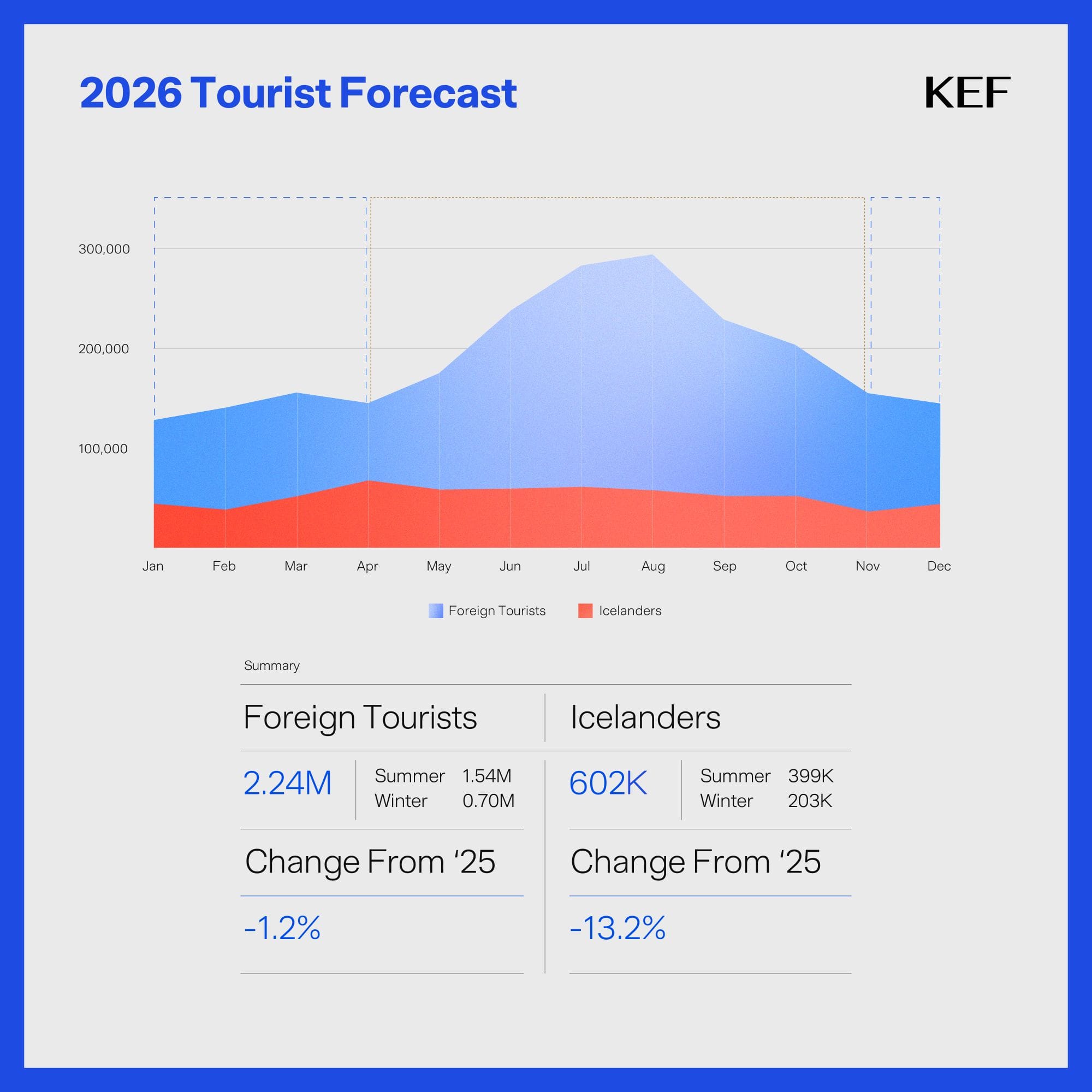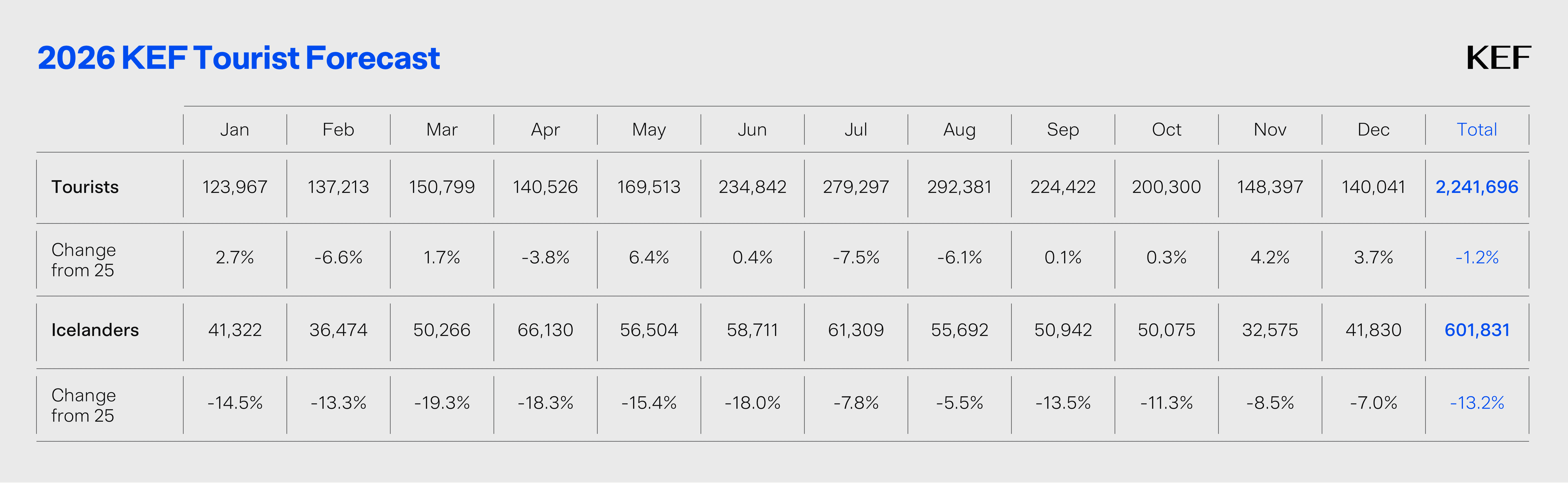 The tourist forecast includes both foreign tourists arriving in Iceland and Icelanders travelling abroad via KEF. An estimated 2.24 million foreign tourists will visit Iceland in 2026, compared to 2.27 million in 2025, a 1.2% change. However, international travel by Icelanders is expected to decline significantly next year, with 602,000 trips projected, down from 693,000 this year (a 13.2% decrease).