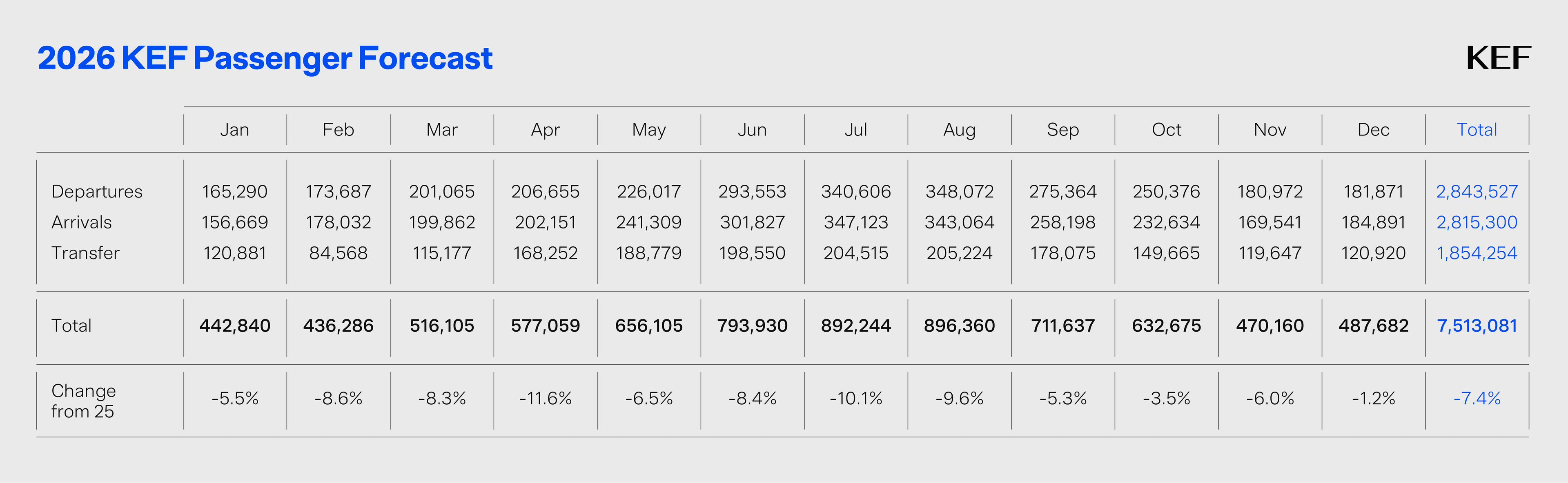 The 2026 KEF Passenger Forecast is based on an analysis of factors influencing passenger demand for flights to and from the airport. The forecast relies on data about handling times secured by airlines, information from KEF Airport's systems, and updates on airline plans.